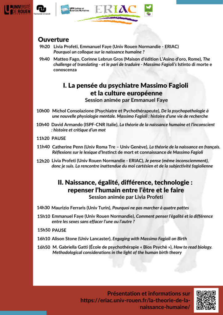 L’iniziativa di questo convegno proviene dalla pubblicazione nel 2022 di Instinct de mort et connaissance, traduzione francese del primo libro dello psichiatra italiano Massimo Fagioli[1], nel cinquantenario della sua prima edizione. Il libro contiene i fondamenti della teoria fagioliana sulla nascita umana, secondo la quale la realtà mentale in quanto pensiero si crea a seguito della reazione della sostanza cerebrale del feto allo stimolo della luce, all’uscita dal canale del parto. Sulla base di questa teoria, Fagioli, scomparso nel 2017, ha svolto la sua prassi terapeutica per più di cinquanta anni e prodotto decine di pubblicazioni tra libri, testi di corsi universitari e articoli.